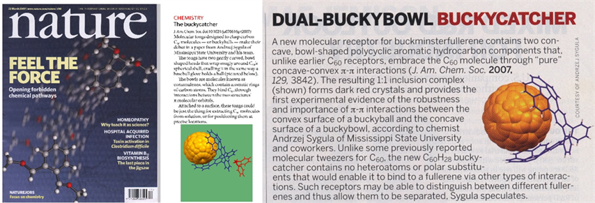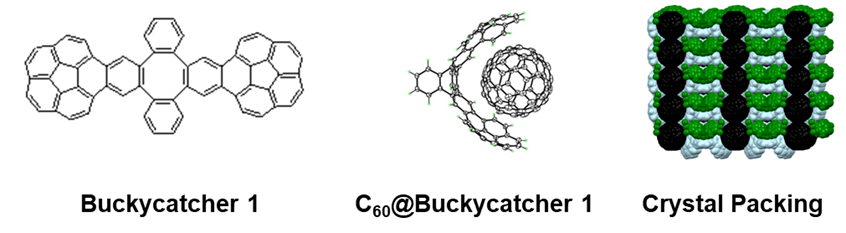 A single-crystal X-ray crystallography of the complex showed that the fullerene molecule is placed nicely in the center of a doubly concave cleft of Buckycatcher with most of the corannulene pincers carbon atoms being in van der Waals contact with the fullerene cage. These results provided the first experimental evidence for the importance of concave-convex pie-pie interactions in the supramolecular chemistry of fullerene carbon cages and buckybowls. The discovery, published in J. Am. Chem. Soc. 2007, 129, 3842, was announced in the Research Highlights sections of Nature (2007, 446, 360), Chem. Eng. News (2007, 85, 37) and Nature Nanotech. (2007, March 23). To date, the original paper has been cited over 350 times.