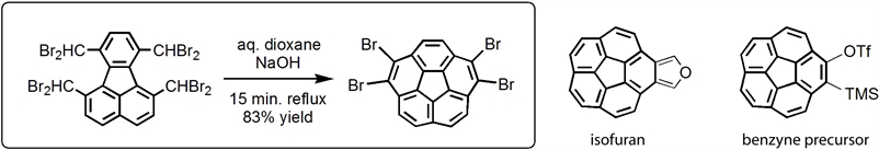 Despite the undisputable success of the FVP methodology a need for practical, solution-based large scale synthesis of buckybowls has become evident if these novel systems were to be thoroughly studied. Our DOE sponsored program achieved a major breakthrough with a development of a solution, multigram scale synthesis of the corannulene framework with excellent yields (>80%) by simply refluxing 1,6,7,10-tetrakis(dibromomethyl)fluoranthene in aqueous dioxane with a little sodium hydroxide.